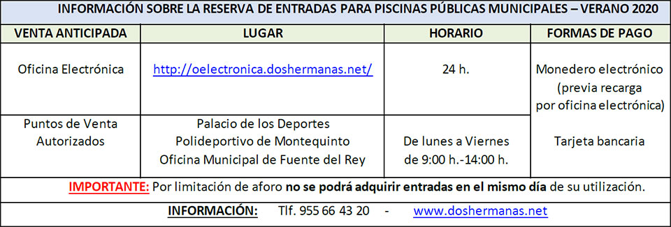 Todas las Piscinas Públicas Municipales de Baño Recreativo abren sus puertas al público el viernes 3 de Julio. Este año para poder controlar el aforo a piscinas no se distribuyen bonos. El precio de la entrada única es de 3€, se pueden comprar un máximo de 6 entradas por persona y día, que además deben ir a la piscina en grupo.